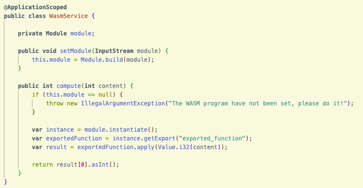 InputStreamand builds a Wasm Module out of it, reading the structure and the instructions contained. The Module will be stored into an example local variable to be reused. - “compute” is a method that takes a simple user input (an